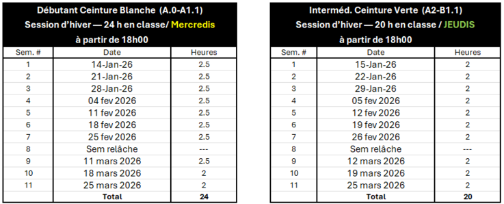 « Excellente école et excellent professeur. On apprend en groupe, mais on progresse à notre rythme, sans pression. Le matériel en ligne est très complet et Jorge est disponible par courriel pour nos questions. La salle est agréable et il y a toujours du stationnement gratuit. »